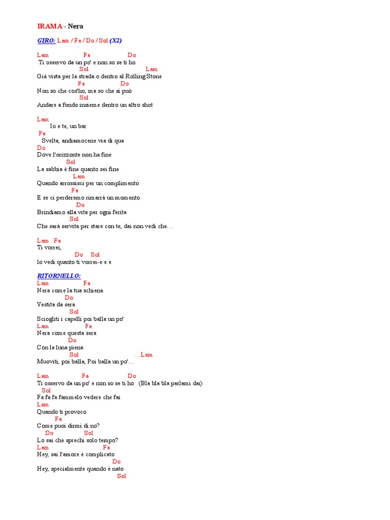 Nera è un brano scritto e interpretato da filippo maria fanti, conosciuto dal grande pubblico col nome d'arte irama, contenuto nel lp piume pubblicato il 1. Testo e accordi per chitarra di nera, in tonalità lam. Accordi chitarra spartiti tab e testo della canzone nera di irama 1000note. Leggi il testo di nera di irama tratto da plume su rockol. Vi spiego passo a passo gli accordi semplici.